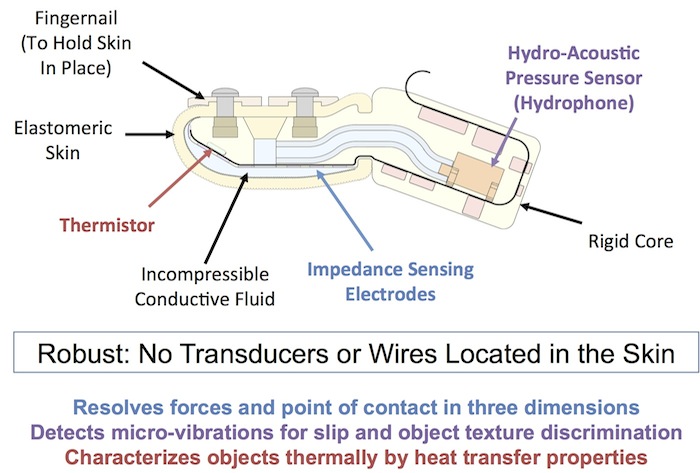 Particular focus was paid to develop a robust tactile sensor that has the sensitivity and response to all tactile sensing modalities found in the human fingertip. While human fingers have mechanisms to repair themselves while damaged, we do not have these luxuries in the artificial world. Instead the design goal of the BioTac was to develop a sensor that is low cost and easy to repair when it inevitably wears out or becomes damaged.