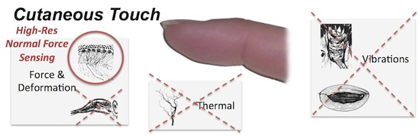 Unfortunately, the Cutaneous sense of touch has not enjoyed this level of progress. Most tactile sensors have developed along what we consider to be the wrong direction. Many engineers have mistakingly concluded that the biological sense of touch is merely a high-resolution sense of normal forces to create an high resolution image of a surface, or as we mockingly refer to them at SynTouch: "taxels".