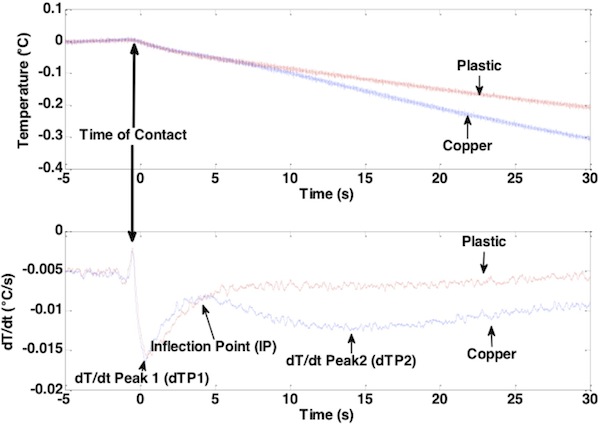 Because the conductivity of the fluid or gel increases with temperature, a thermistor is incorporated for thermal compensation. Thermal energy from the embedded electronics is used to heat the finger above ambient temperature, similar to the biological finger. This enables the material properties of contacted objects to be inferred from thermal transients measured by the thermistor on the surface of the core. Upon contact with a test object, the derivative of temperature (dT/dt) has several reproducible features (Fig). The initial negative peak (cooling) is similar for all materials; it occurs when the cooler skin is pushed against the warmer core. After the inflection point, the curves diverge and are dependent on heat capacity and conductivity of the object.