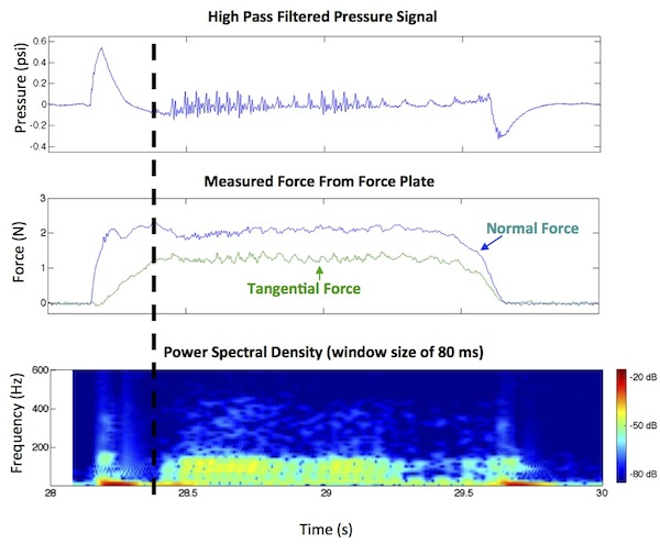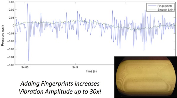 When the human finger slides over various surfaces vibrations are produce from the sliding friction. The human finger has specialized receptors to detect these vibrations which are essential for detection of slip and discrimination of surface textures as well as general tool usage. These same vibrations travel very efficiently through the BioTac fluid which is incompressible. They are then detected by the pressure transducer which has specially designed analog filters to optimize the sensitivity. The addition of fingerprints to the BioTac have been demonstrated to greatly enhance these vibrations.